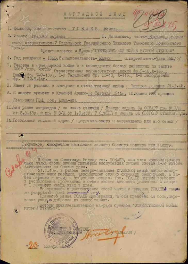 К слову, отец Касым-Жомарта Токаева получил орден Отечественной войны II степени за мужество и героизм, проявленные в январе 1945 года в Польше. В документе, который опубликовали в Минобороны Российской Федерации, указали, что "товарищ Токаев первый ворвался в расположение противника и огнём своего автомата уничтожил пять немцев, и одного раненого взял в плен".