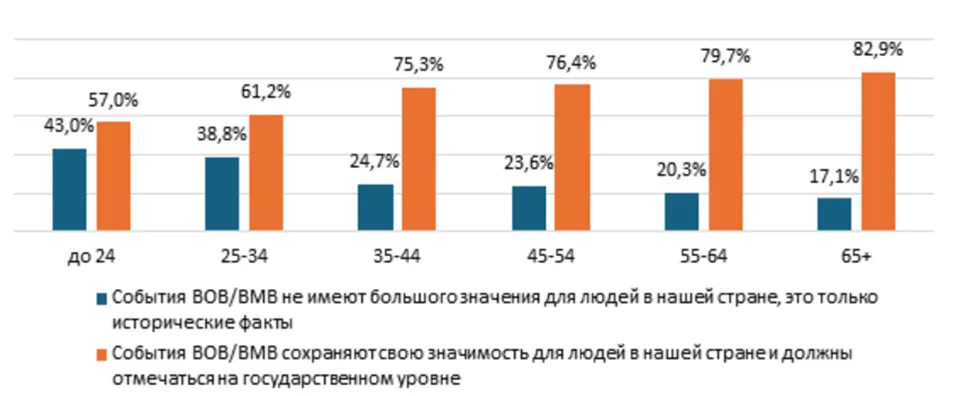 «Респонденты в возрасте до 34 лет видят всё меньше смысла в сохранении памяти о Великой отечественной/Второй мировой волне как на семейном уровне, так и на уровне страны. У тех, кто старше 35 лет чаще иная точка зрения – от 75% и выше в средних и старших возрастных группах считают, что надо сохранять общую и семейную память о военных событиях», – подчеркнули в исследовании.