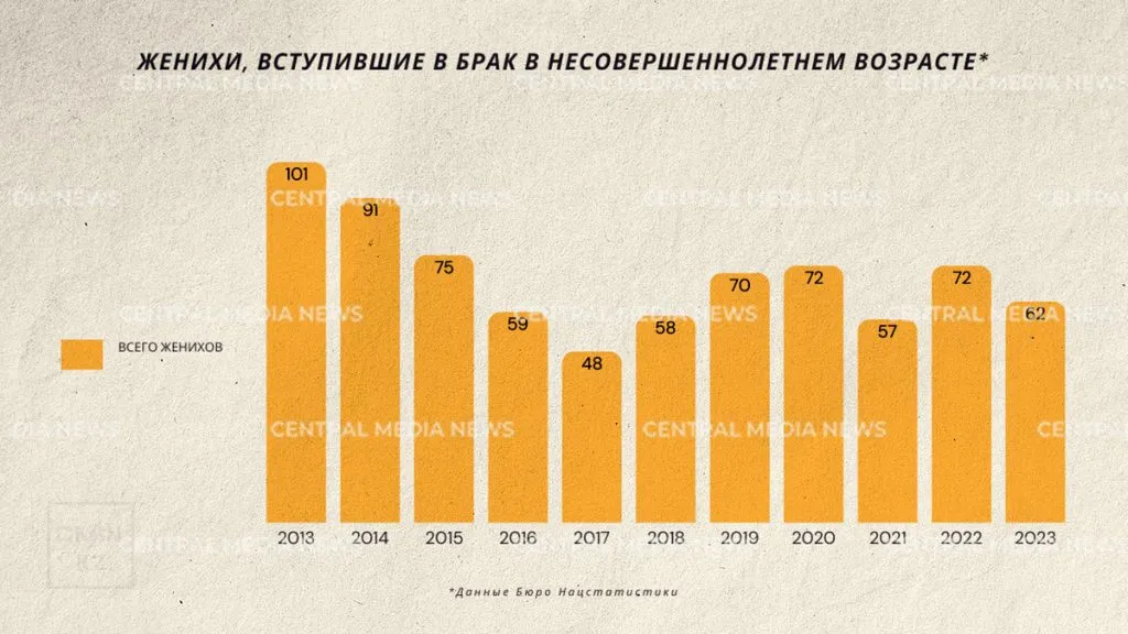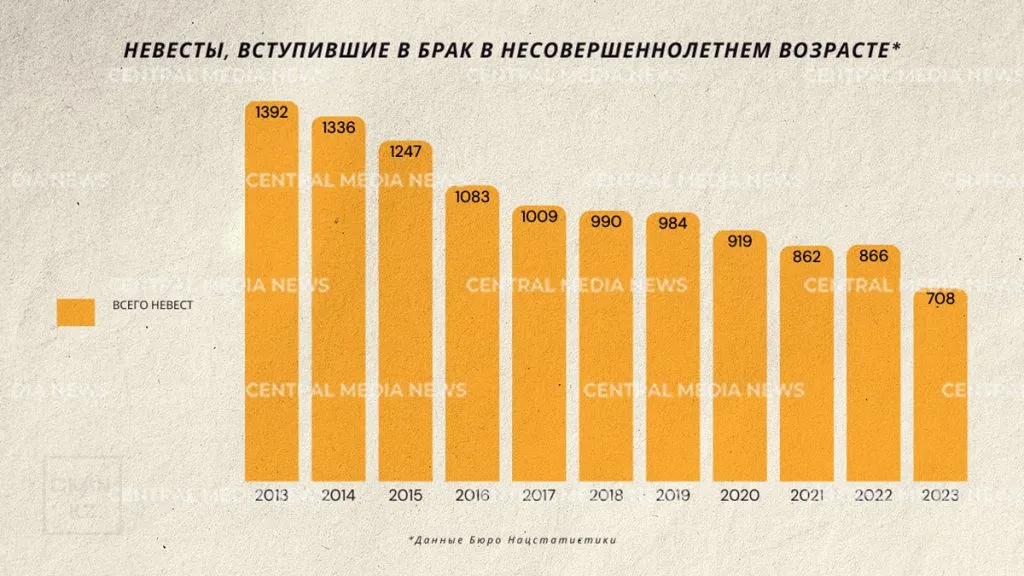 Согласно данным Бюро Нацстатистики, в 2023 году 770 несовершеннолетних вступили в законный брак. Среди них 708 – девочки и 62 – мальчики. Отметим, что для восьми девочек это был не первый брак. В сравнении с 2013 годом, число создавших ячейку общества несовершеннолетних снизилось в два раза. В 2013 году этот показатель составил 1493 человека, среди которых девочек – 1392, а мальчиков – 101.