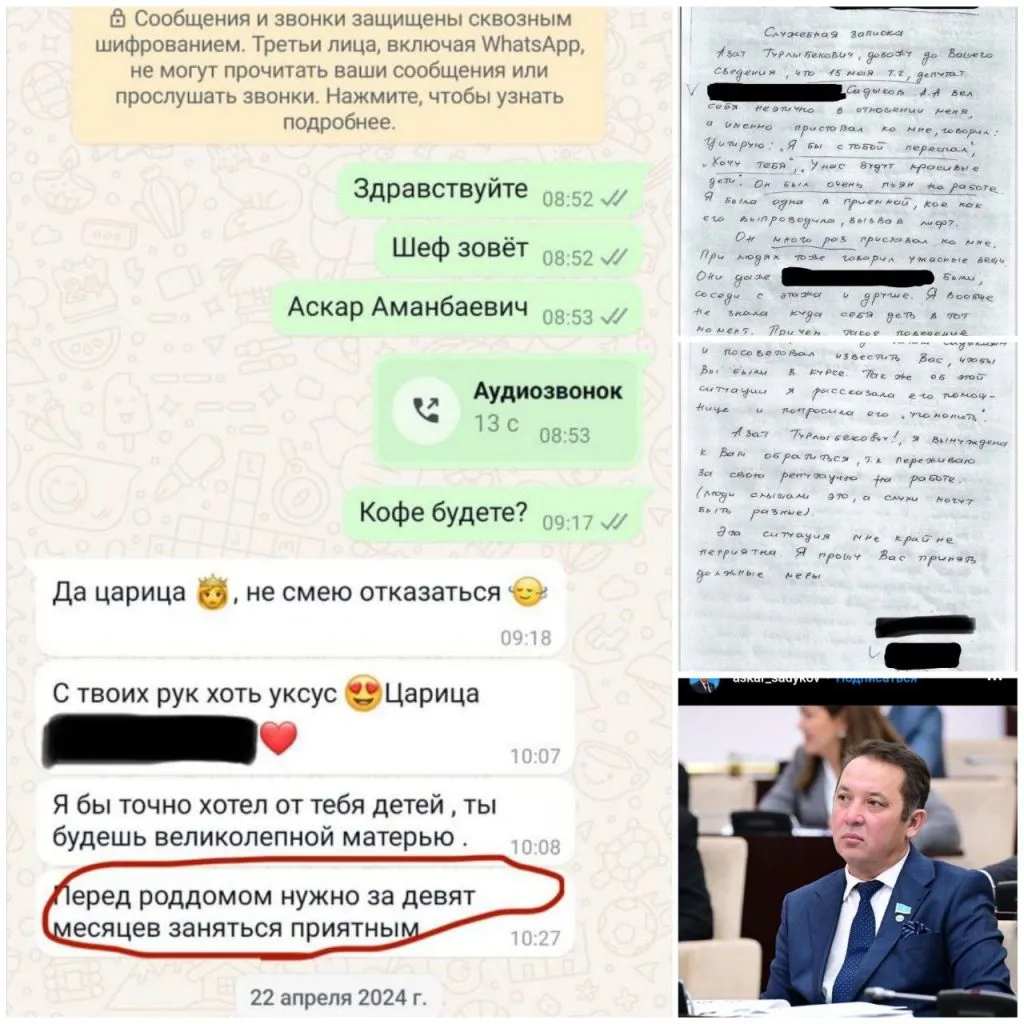 Перуашев выложил скриншоты переписки, на которых Садыков пристаёт к сотруднице. Позже он удалил фотографии, заявив, что сделано это по просьбе заявительницы. Сам Аскар Садыков же называет ситуация «грязными играми и манипуляцией». При этом экс-депутат никак не оспаривал факт харассмента.