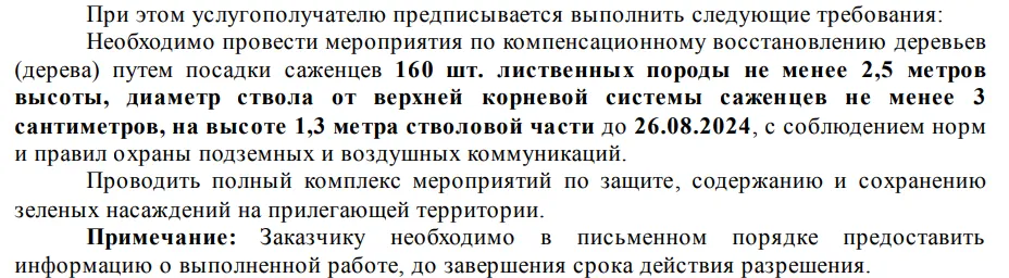 В этом году для "благоустройства территории и приведения в эстетический вид" деревья (тополь, клён и вяз) в количестве 16 штук вырубили. Вместо них ТОО обязано до 26 августа 2024 года посадить 160 насаждений лиственных пород.