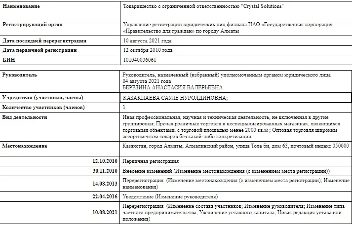Изначально застройщик ТОО «Crystal Solutions» принадлежал давнему бизнес-партнёру Динмухамента Идрисова – Бахаридину Аблазимову (№29 из списка Forbes, активы оценили в 305 млн долларов). Перед тем, как предприятие и его сотрудники приступили к масштабному проекту строительства девятиэтажных жилых домов с мансардными этажами, со встроенными и пристроенными нежилыми, складскими помещениями и подземным паркингом, учредитель и директор ТОО сменились. Новым владельцем стала Сауле Казакпаева и директор Анастасия Березина. Последняя была владельцем акций золотодобывающей компании AltynEx Company, до того как Динмухамет Идрисов их передал Рашиту Сарсенову.