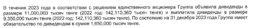 Возможно, решение АО "Joint Resources" (акционер Тимур Кулибаев, на 31 декабря 2023 года доверительно управляло ТОО "PREMIER MANAGEMENT") по дивидендам связано с их предыдущими выплатами в прошлом и позапрошлом году. Деньги перечисляли несколько раз: 142 млрд тенге (за 2022 год) и 9,3 млрд тенге (За 2022 и первый квартал 2023 года должны были перечислить 11 млрд тенге. На 31 декабря долг составлял 1,6 млрд тенге. Их выплатили уже в 2024 году). Отметим, что сам Тимур Кулибаев, как акционер АО "Joint Resources" решил не выплачивать дивиденды за 2022 год. Такой же позиции он придерживался и в этому году.