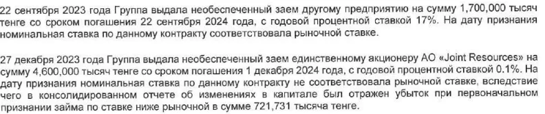 В конце 2023 года организация дала в долг своему акционеру – 4,6 млрд тенге под 0,1% годовых. Погасить кредит "Joint Resources" должен до 1 декабря 2024 года. Номинальную ставку посчитали нерыночной. В консолидированном отчёте об изменениях отразили убыток при первоначальном признании займа по ставке ниже рыночной в 721,7 млн тенге. В 2024 году "Joint Resources" получил от "Каспий нефть" 1,2 млрд тенге под 0,1% до 1 декабря этого года.