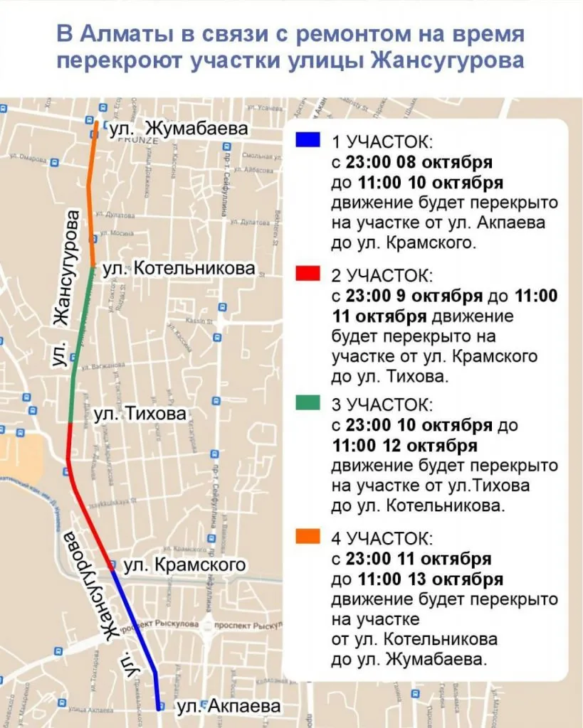 С 23:00 8 октября до 11:00 10 октября движение будет перекрыто на участке от улицы Акпаева до улицы Крамского. Объезд будет обеспечен по проспектам Рыскулова и Сейфуллина.