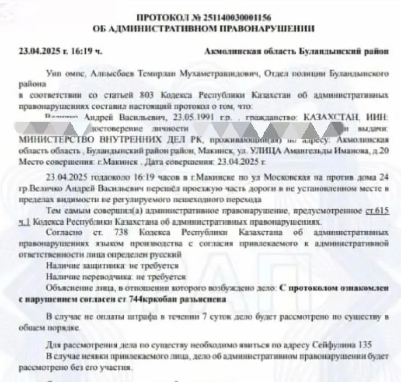 Однако согласно официальному протоколу, который также показал оштрафованный, "Андрей Васильевич перешел проезжую часть дороги в неустановленном месте в пределах видимости не регулируемого пешеходного перехода. Тем самым совершил правонарушение, предусмотренное статьей 615 части 1 КОАП РК". По этой статье несчастный должен оплатить 2МРП штрафа - 7862 тенге. Правда сумму можно было сократить вдвое, если оплатить в течение 7 дней.