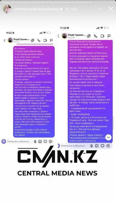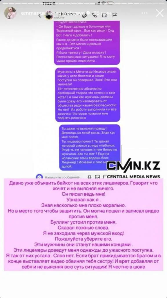 "Я подошла к имаму, в мечети мужчины видели эту ситуацию и не заступились, а наоборот накинулись на меня. Не защитили меня, а сделали виноватой, сказав, что я хочу хайпа. Все в мечети знали, какие поступки он совершал, какие у него болезни. Они как мужчины должны были сразу изолировать его от общества ради нашей безопасности".
