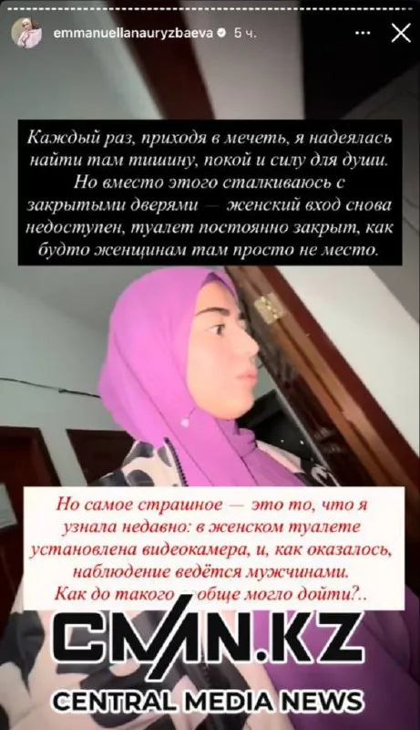 "Каждый раз приходя в мечеть, я надеюсь найти там тишину, покой и силу для души. Но вместо этого сталкиваюсь с закрытыми дверями. Женский зал снова недоступен, туалет постоянно закрыт, как будто женщинам там просто не место", – рассказала блогер.