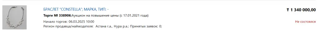 Отдел расследований уже писал об элитном имуществе, которое вернули государству. Всего Казахстану отдали 196 украшений. В сентябре 2024 года и начале 2025 года на электронных торгах уже выставляли дорогие аксессуары: на аукционе не смогли продать изделия из драгоценных металлов и бриллиантов.