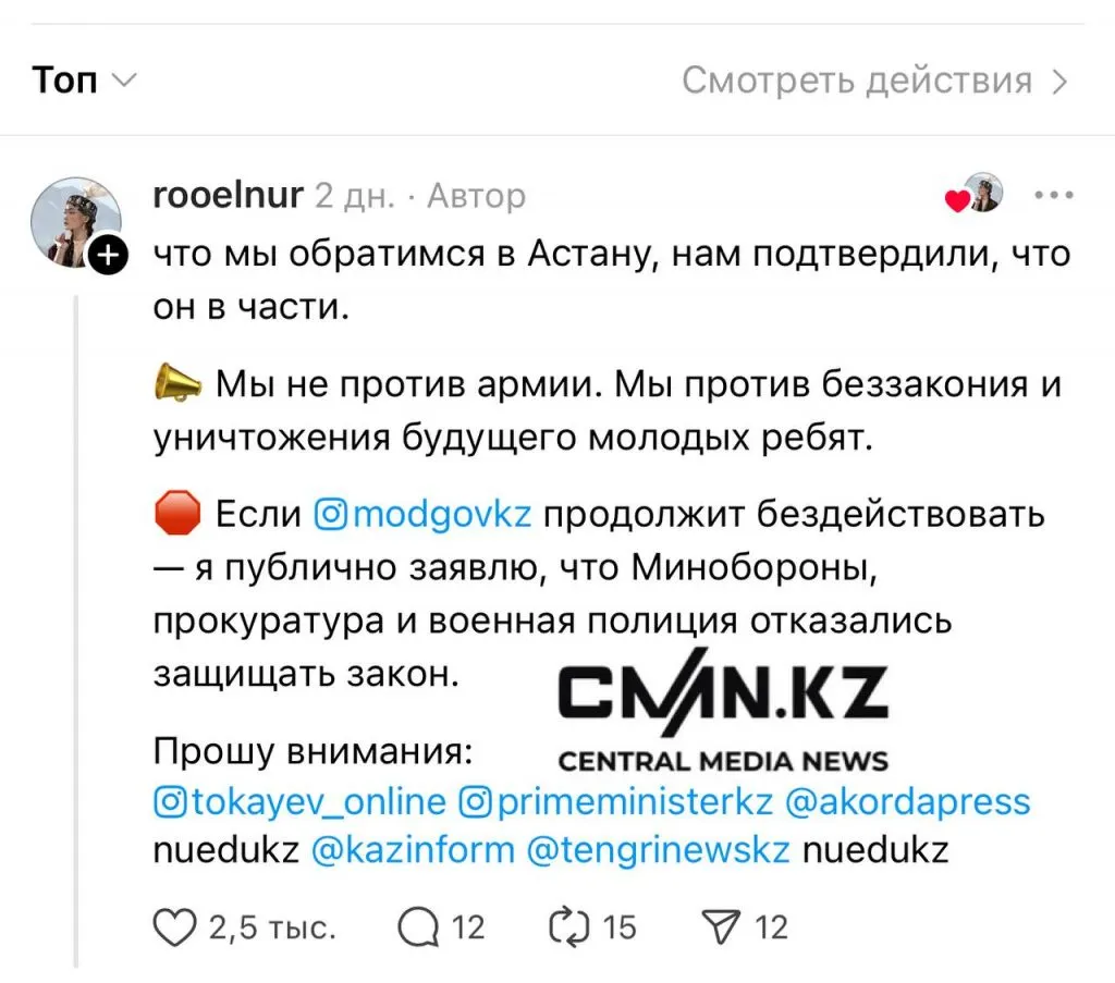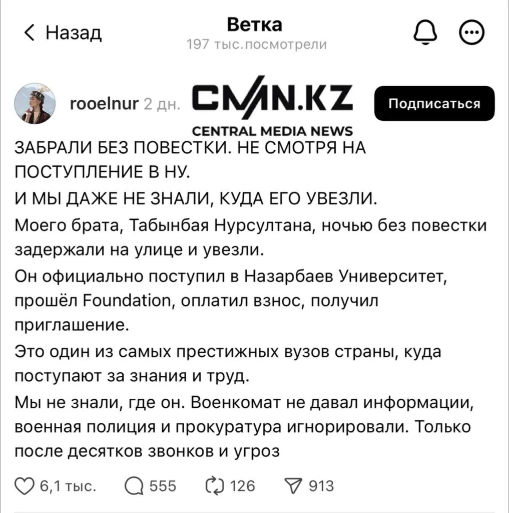 7 июня 2025 года в социальных сетях девушка опубликовала пост, в котором рассказала, что её брата без повестки ночью задержали сотрудники военкомата Алматинской области и увезли неизвестно куда. Она также отметила, что брат поступил в Назарбаев Университет. Тем временем в вузе прокомментировали ситуацию и сообщили, что молодой человек среди студентов не числится, передаёт CMN.KZ