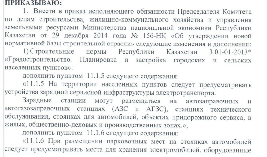 Приказ о внесении изменений в государственные нормативы в области архитектуры, градостроительства и строительства по размещению зарядных станций для электромобилей появился на официальном сайте госорганов Казахстана. Он составлен Министерством промышленности и строительства РК и Комитетом по делам строительства и жилищно-коммунального хозяйства. Чего коснутся новые нормы, рассказывает CMN.kz