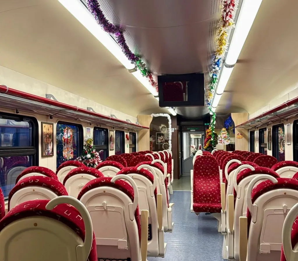 Состав электропоезда украшен в новогодней тематике. В вагонах повсюду снежинки, изображения Деда мороза и Снегурочки, ёлочные игрушки и гирлянды, сообщает CMN.KZ со ссылкой на АО "Пассажирские перевозки"
