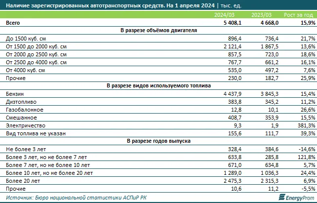 Количество транспорта в стране за год выросло на 15,9%. К 1 апреля на дорогах Казахстана насчитывалось порядка 5,4 млн различных машин, сообщает CMN.KZ со ссылкой на Energyprom.kz.