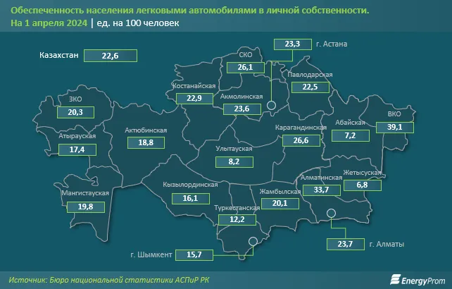 Больше всего машин в собственности у жителей Восточно-Казахстанской области: 39,1 на 100 человек. А меньше всего в Жетысуском, Абайском и Улытауском регионах.