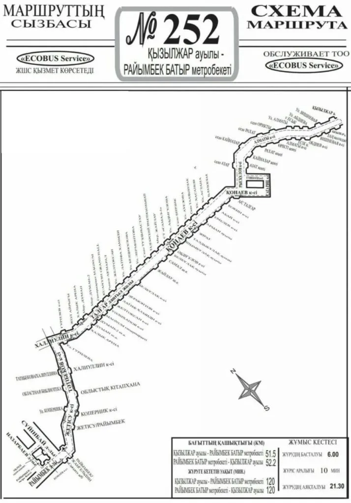 «На маршруте № 252 задействовано 25 автобусов, которые курсируют с плановым интервалом в 10 минут. Обслуживанием маршрута занимается перевозчик ТОО «ECOBUS SERVICE», — рассказали в акимате.