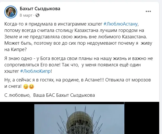 Сейчас Бахыт Сыздыкова занимается бизнесом и имеет авторскую методику по похудению. Исходя из публикаций в Facebook, женщина также более двух лет проживает на Кипре, проводит инвестиционные туры и ликбезы по покупке недвижимости на этом острове.