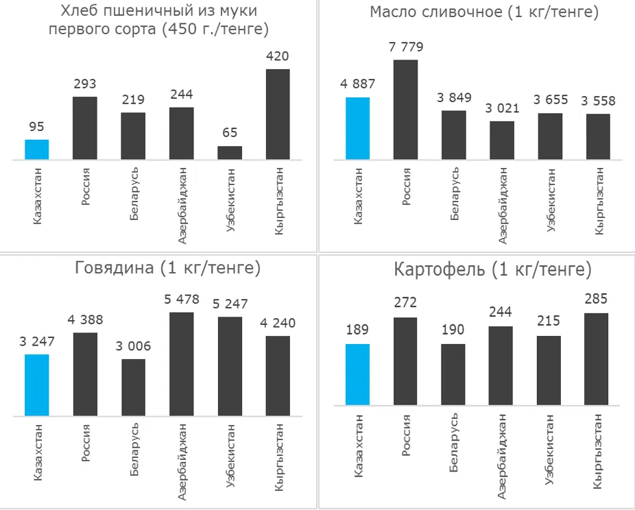 Казахстан на фоне соседей действительно имеет сравнительно низкие цены на базовые продукты, однако остаётся уязвимым из-за высокой зависимости от импорта отдельных категорий продовольствия и товаров широкого потребления. Рост (особенно по говядине, маслу, овощам) часто опережает доходы населения.