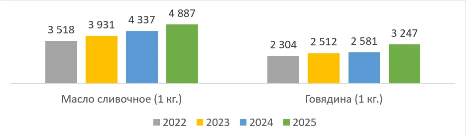 Согласно данным Бюро национальной статистики, динамика средних цен в 2022–2025 годах выглядит следующим образом (тенге):