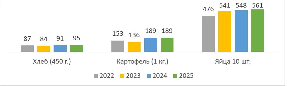 Сравнение средних цен на ключевые продукты – хлеб, масло сливочное, говядину, картофель и яйца – показывает, что Казахстан по большинству позиций находится в середине или в нижней ценовой группе среди шести выбранных государств. Однако структура различий указывает на более глубокие особенности экономики и продовольственного рынка.