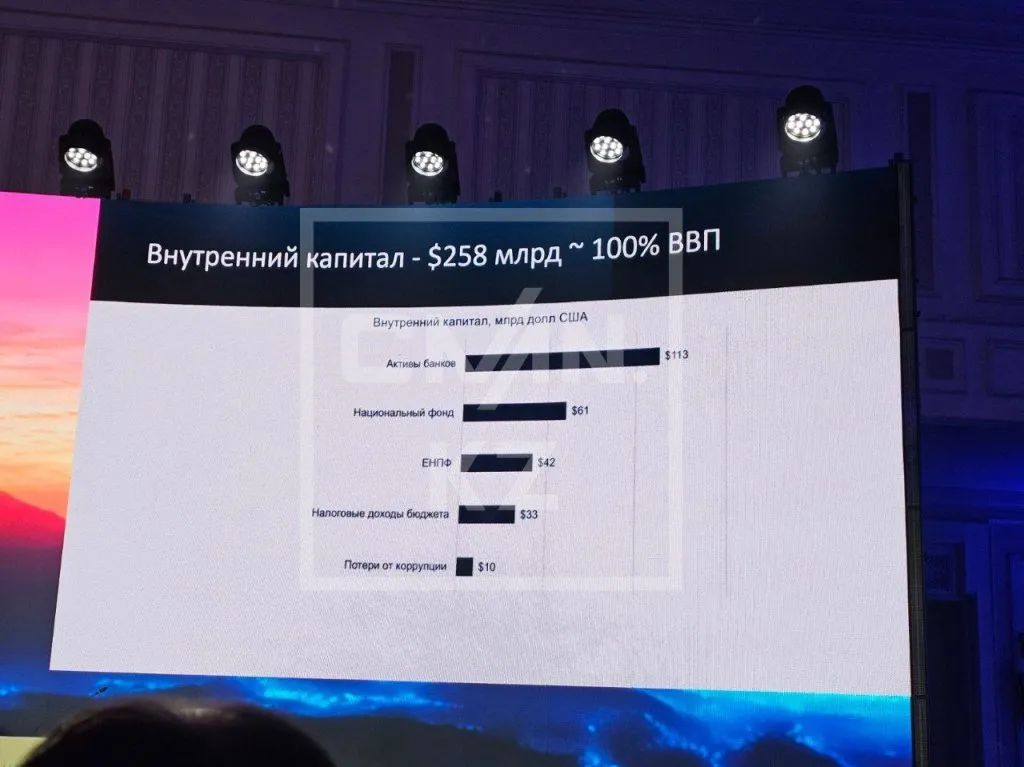 В своём докладе спикер отметил, что Казахстан стал страной с капиталоизбыточной экономикой и нетто-экспортёром капитала. По примерным оценкам, внутренний капитал составляет 100% ВВП или 258 млрд долларов.
