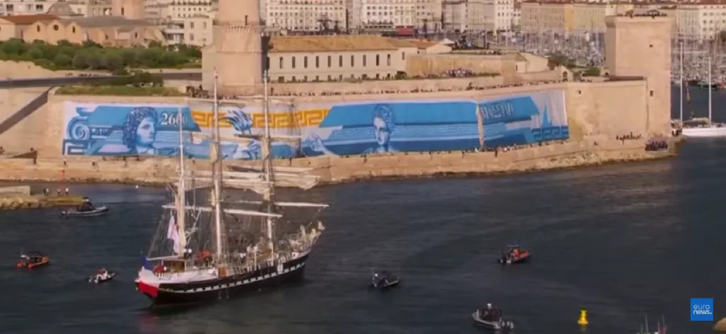А накануне факел был доставлен в южный французский город Марсель на борту парусника XIX века "Белем". Судно вошло в порт под гимн Франции. За красочной церемонией с набережной наблюдали около 50 тысяч человек.