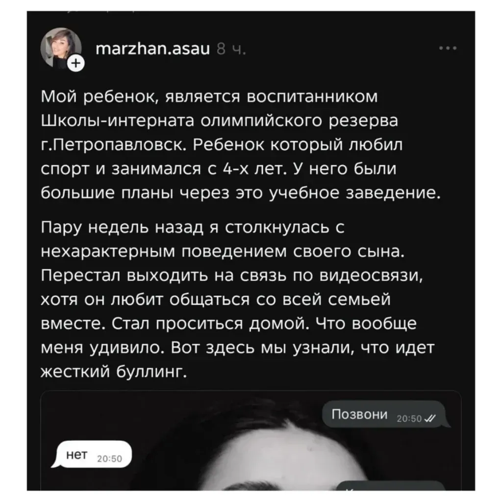 В социальных сетях мать ребёнка Маржан Асау заявила, что детей надо спасать. По её словам, сын занимается спортом с четырёх лет и у него были большие планы.