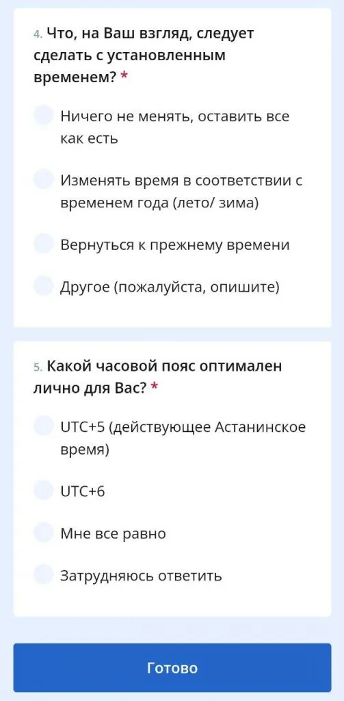 В общей сложности, казахстанцам предлагают ответить на пять вопросов. Пожалуй, самым главным из них является: "Что следует сделать с установленным временем?".