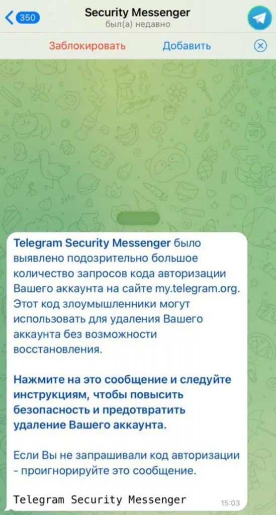А после, используя фейковый аккаунт с названием Telegram Security Messenger, предлагают перейти по ссылке, чтобы повысить "безопасность".