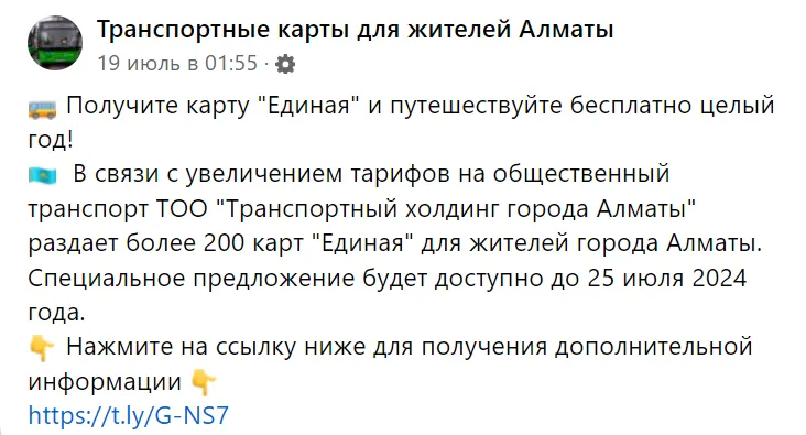 «В связи с увеличением тарифов на общественный транспорт ТОО "Транспортный холдинг города Алматы" раздает более 200 карт "Единая" для жителей города Алматы. Специальное предложение будет доступно до 25 июля 2024 года. Нажмите на ссылку ниже для получения дополнительной информации»,