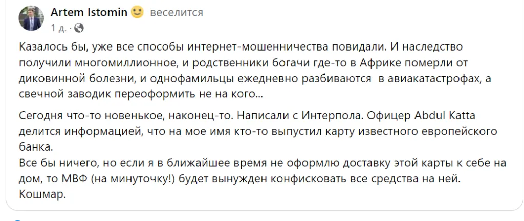 Все бы ничего, но если я в ближайшее время не оформлю доставку этой карты к себе на дом, то МВФ (Международный Валютный Фонд прим. ред.) будет вынужден конфисковать все средства на ней. Кошмар», — пишет Истомин.