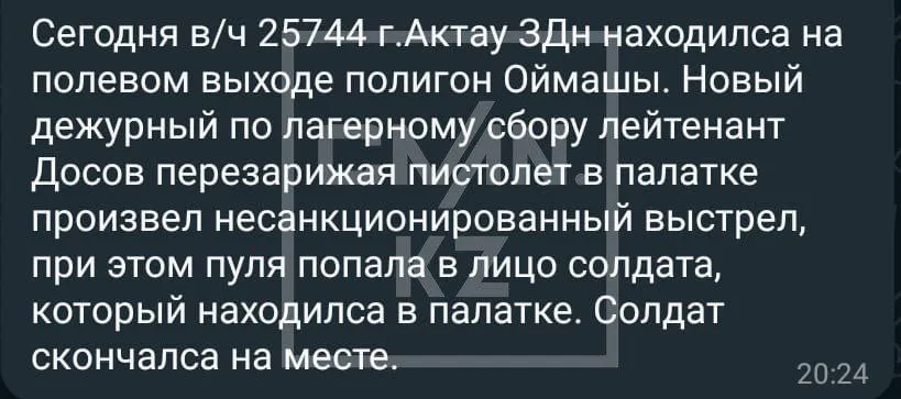 Ранее стало известно, что в Мангистауской области солдат получил смертельное ранение.