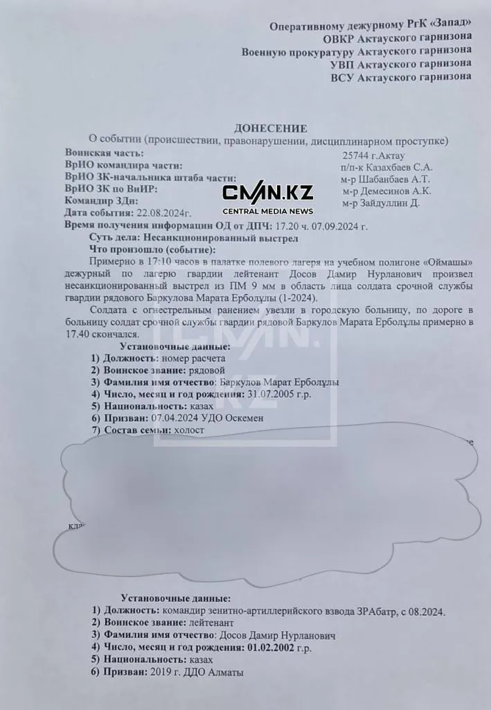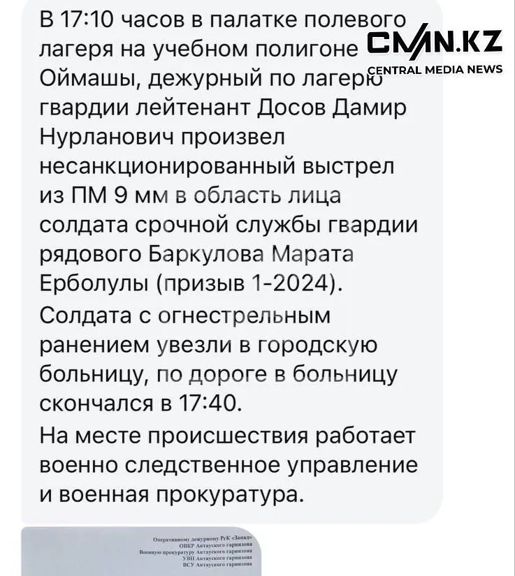 «Еду в военный округ города Актау. Моего сына застрелили с пистолета в лицо. Теперь как говорят это был несчастный случай – офицер играл с пистолетом и тот сам по себе якобы выстрелил. Я прошу министра обороны чтобы это дело так просто не сошло – якобы это несчастный случай. Здесь нет несчастного случая: чтобы пистолет стрельнул надо патрон заслать в патронник, снять с предохранителя и нажать на курок. Это была не игра, а офицер точно не игрался. Сейчас говорят его закрыли. Возможно, захотят замять дело. Я хочу, чтобы досконально все изучили», - заявил отец солдата.