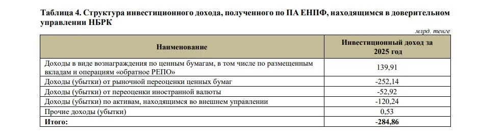 В части управления пенсионными активами основной строкой по потерям стала переоценка ценных бумаг – минус 252,1 млрд тенге. Ещё 120,2 млрд тенге потеряли из-за внешнего управления. От переоценки иностранной валюты также появился убыток в 52,9 млрд тенге. А вот вознаграждение по ценным бумагам показало плюс 139,9 млрд тенге.