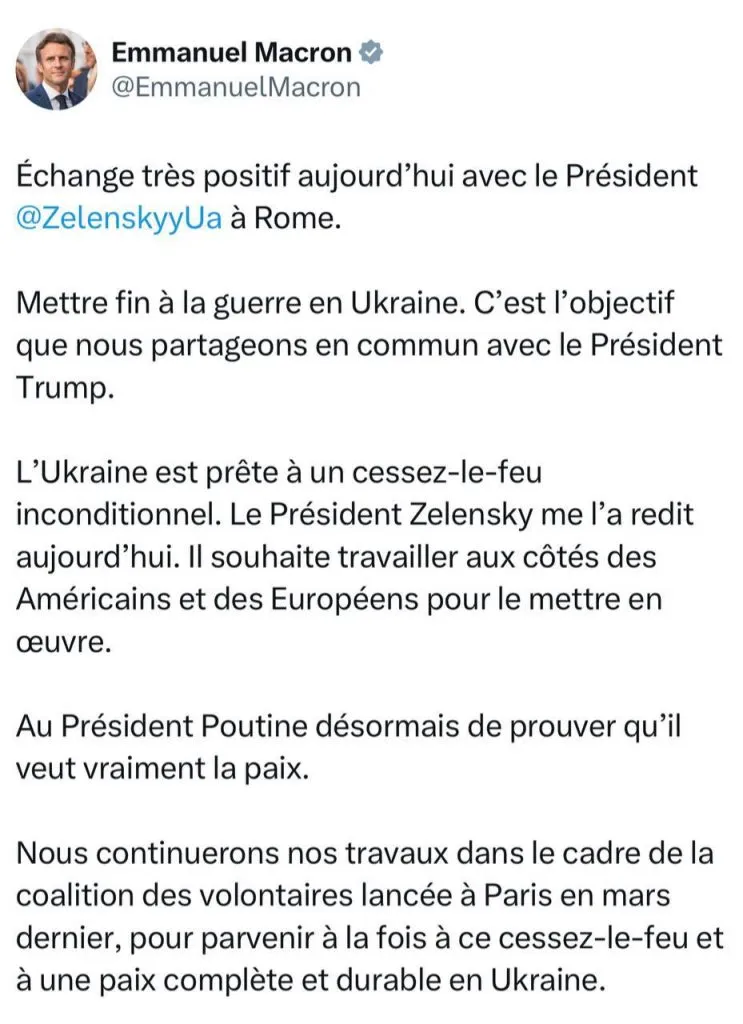 Украина готова к безоговорочному прекращению огня. Президент Зеленским сегодня снова мне сказал об этом. Он хочет вместе с европейцами и американцами работать над этим. Теперь президенту Путину предстоит доказать, что он действительно хочет мира. Мы продолжим нашу работу в рамках коалиции добровольцев, - написал Макрон в соцсети Х.