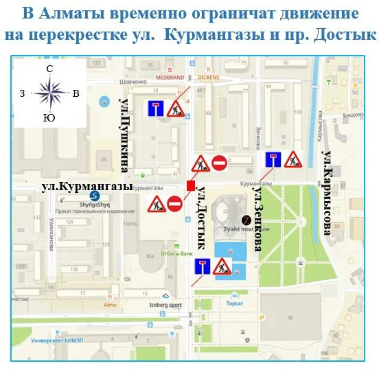 Как уточнили в ТОО «Алматинские тепловые сети», движение будет закрыто на пересечении улиц Курмангазы и Достык с 7:00 18 сентября до 7:00 19 сентября.