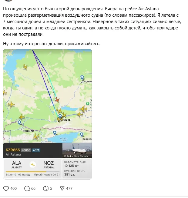 "Чуть позже объявили, что ситуация стабилизировалась и самолет возвращается в Алматы. Никогда не думала, что испытаю что-то похожее. Но так сильно жить ещё никогда не хотелось", – добавила девушка.