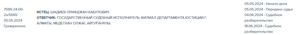 В апреле 2024 года в Алматинский городской суд поступил иск от Орифджана Шадиева. Ответчиком по делу выступал Департамент юстиции Алматы и его сотрудник Олжас Медетхан. К сожалению, в судебном кабинете пока нет загруженных документов. По данным Nege.Aqsha, Шадиев хочет уменьшить сумму долга до нуля. Якобы проблемы со здоровьем повлияли на его имущественное положение.