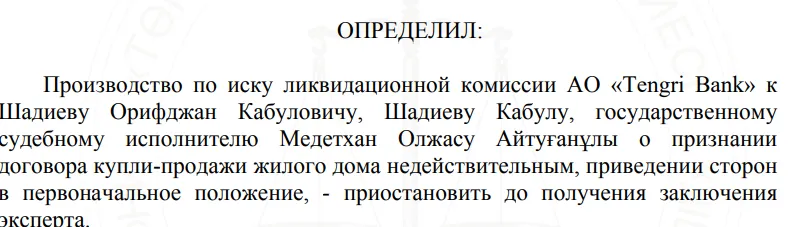 В феврале 2024 года ликвидационная комиссия АО «Tengri Bank» подала иск в суд о признании договора купли-продажи жилого дома недействительным и приведении сторон в первоначальное положение. Речь шла о доме по улице Кенесары хана в мкр. Каргалы в Алматы. Площадь участка составляла 0, 3170 га, а сам дом – 660,9 квадратных метров. Объект продали 21 ноября 2023 года.