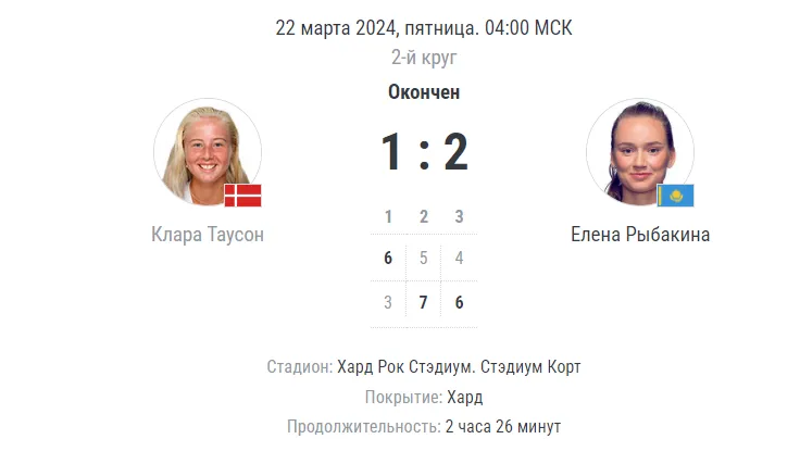 В следующем раунде Елену Рыбакину ждёт игра с 72-й ракеткой мира американкой Тэйлор Таунсенд. Матч состоится уже завтра, 23 марта.