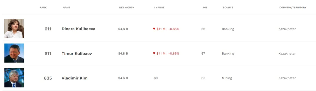 Тимур Кулибаев — муж Динары Кулибаевой, дочери первого президента Нурсултана Назарбаева. Супруги – самые богатые люди в Казахстане по версии Forbes. На февраль 2024 года состояние каждого из них оценивается в 4,8 миллиарда долларов. В мировом же рейтинге супруги занимают 611 строчку.