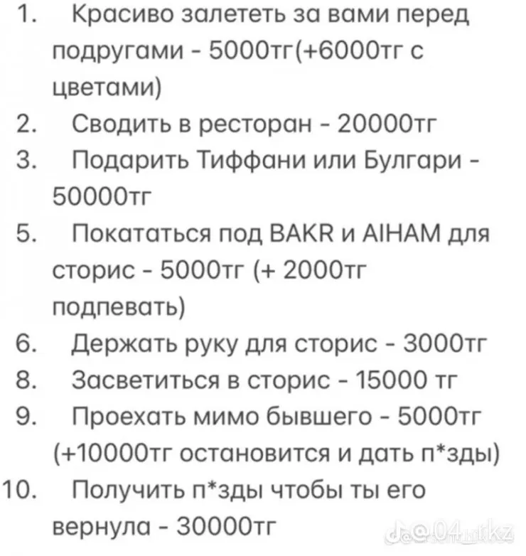 - и даже подраться за вас — 30 тысяч тенге, а если с вашим бывшим, то уже дороже — 50 тысяч.