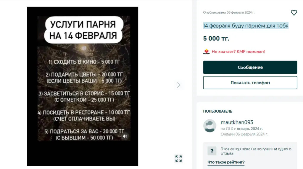 В одном из объявлений на популярном сайте купли-продаж в Казахстане в заголовке указано: «14 февраля буду парнем для тебя». Молодой человек по имени Маутхан из города Семея за поход в кино просит 5 000 тенге, правда, билет на фильм будет за ваш счёт.