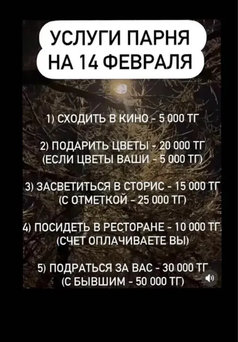 В последние несколько лет в преддверии Дня святого Валентина в социальных сетях и на сайтах купли-продажи появляются объявления, авторы которых предлагают девушкам и парням услуги «парня на 14 февраля». Мужчины выставляют прайс и длинный перечень услуг. Корреспондентка CMN.kz ознакомилась с услугами и поговорила с отважным казахстанцем, готовым подраться с вашим бывшим за определённую сумму.