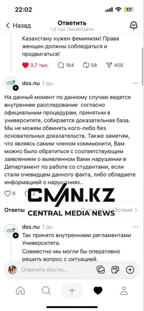Оказалось, что один из студентов вуза всё таки опубликовал в социальных сетях информацию по данному случаю. Темирлан Баймаш в своём посте написал, что администрация вуза не выступила с официальным заявлением и замалчивает подобные случаи.