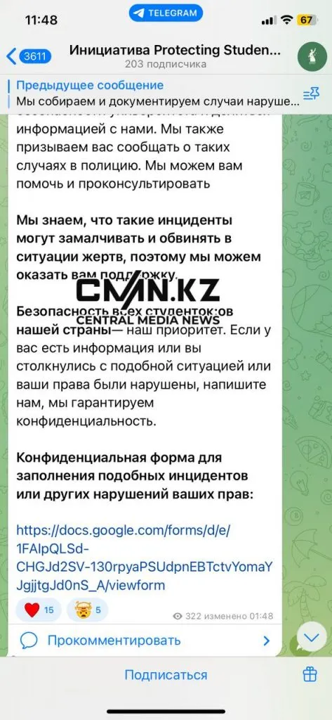 Ну а пока университет молчит и никак не комментирует произошедшее, студентам вуза приходится самим принимать меры и помогать друг другу. Одним из таких шагов стала инициатива Темирлана Баймаша под названием "Protecting Students Rights".