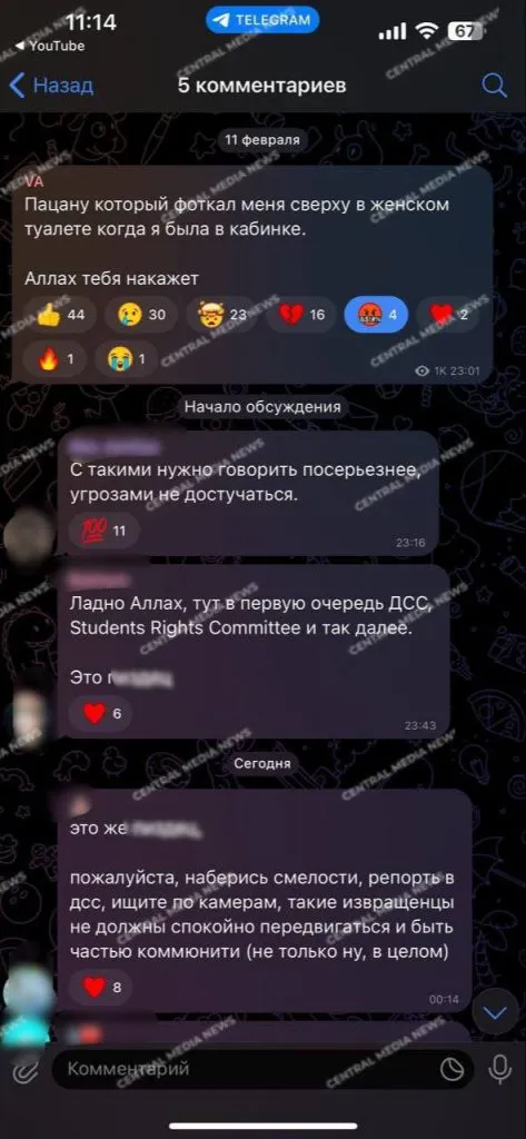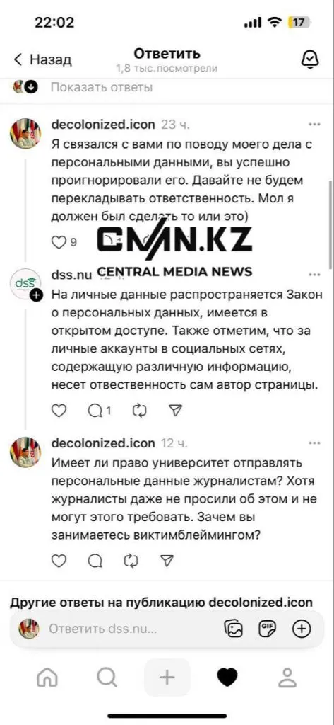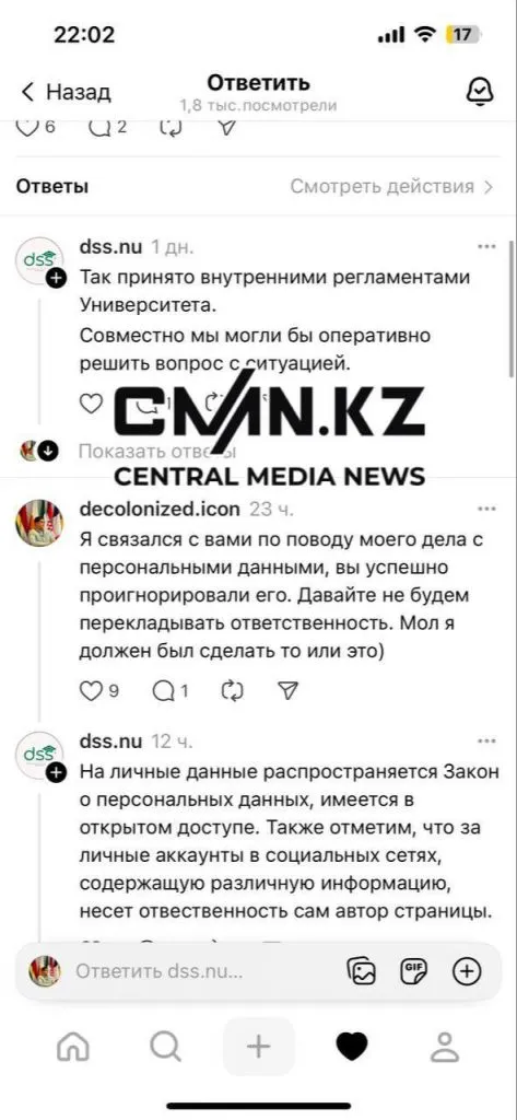 Корреспондент CMN.KZ связалась с автором одного из комментариев, чтобы узнать, откуда у студентов информация об исключении молодого человека. Но комментатор отказался отвечать из-за запрета распространения информации во время проведения внутреннего расследования в учреждении.
