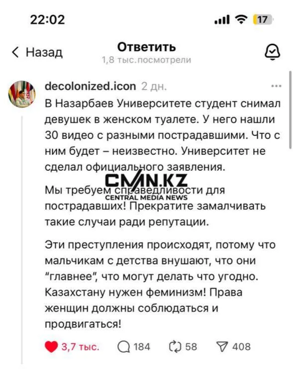 В чатах Назарбаев университета студентки рассказывают о случаях, когда молодой парень фотографировал девушек в кабинках туалета, передаёт CMN.KZ