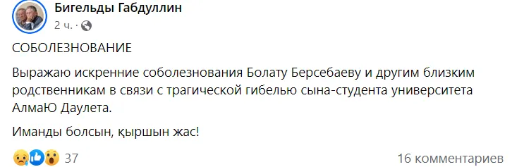 В соцсетях распространяется информация о личности студента алматинского вуза, который 25 сентября 2024 года предположительно совершил суицид. В частности, журналист Бигельды Габдуллин, утверждает, что юноша был сыном бывшего чиновника Болата Берсебаева, передаёт CMN.KZ