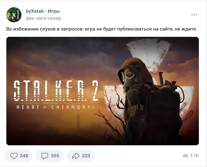 А теперь ещё и команда репакеров (так называют создателей сборок взломанных компьютерных игр) byxatab заявила, что геймерам лучше не ждать от них взлома «Сталкера», чтобы поиграть бесплатно.