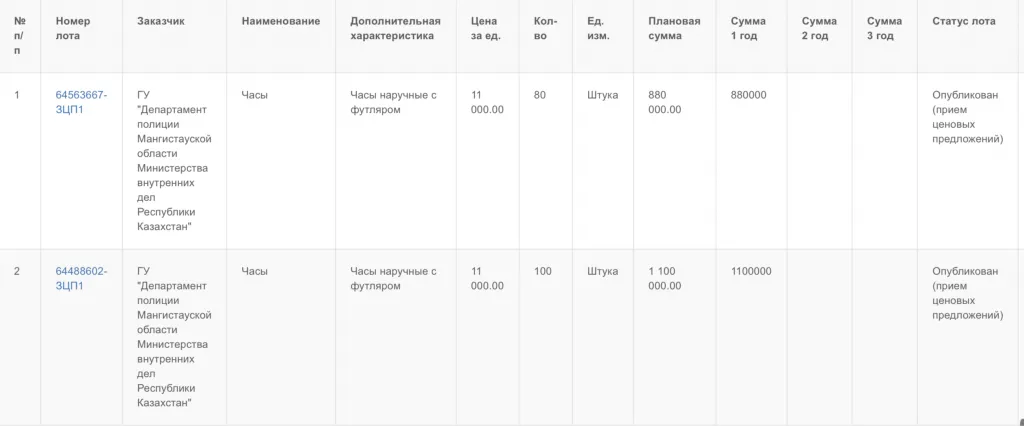 Каждый экземпляр часов обойдется областному департаменту полиции в 11 000 тенге. На комплект женских часов из 80 штук ведомство готовит выделить 880 000 тенге, а на сотню мужских часов — 1 100 000 тенге.